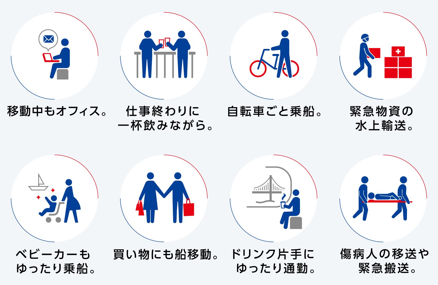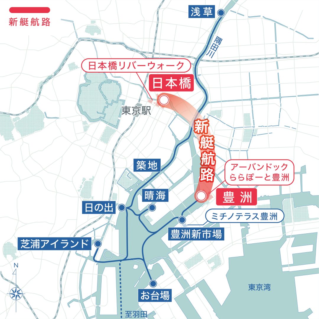 豊洲船着場(アーバンドックららぽーと豊洲)と日本橋船着場(中央区防災船着場)間を片路約25分で結び