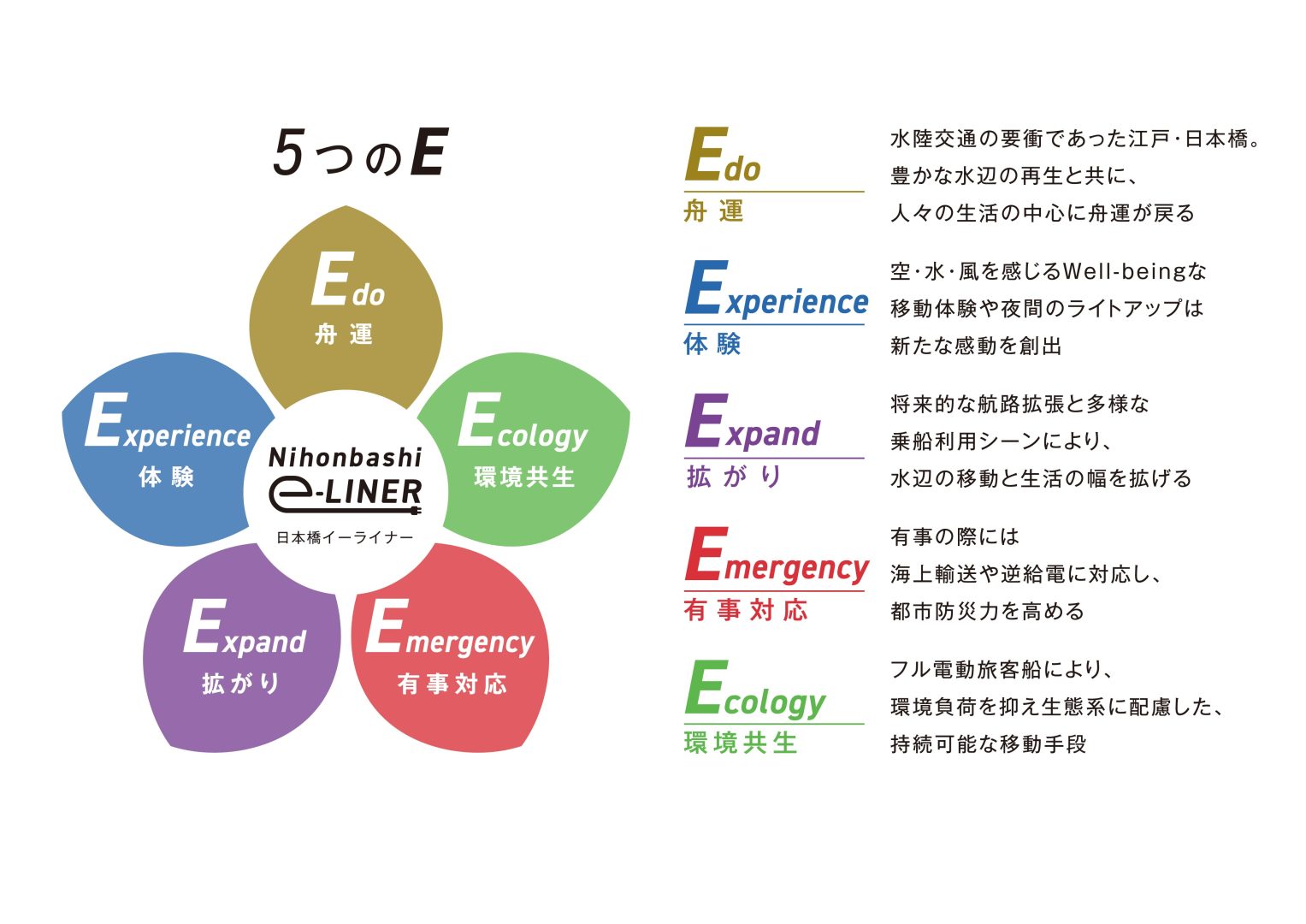 静音、低振動、燃料臭気ゼロに加え、「Nihonbashi e-LINER」の‘e’は5つのeで始まる言葉を表しています。