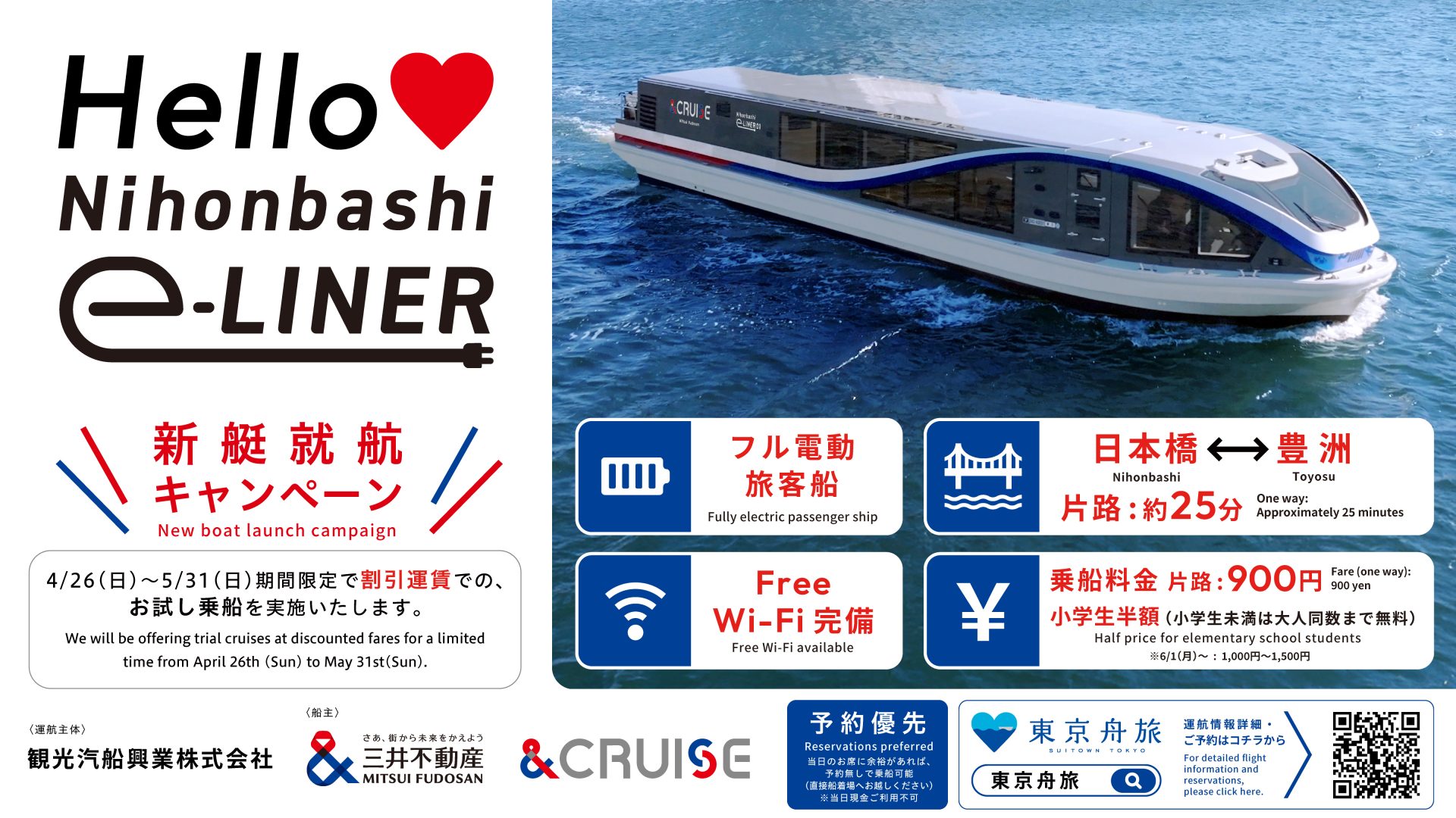 ェクト『&CRUISE』を2026年1月より始動しました。今般、国内初の民間企業によるフル電動旅客船の定期航路である「Nihonbashi e-LINER」が、日本橋・豊洲間で、2026年4月26日(日)より観光汽船興業株式会社(本社:東京都中央区、代表取締役:村岡夏子、以下「観光汽船興業」)を運航主体として、定期運航を開始することをお知らせいたします。