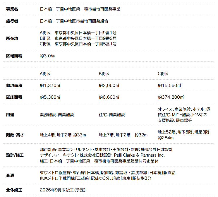 本事業は、日本橋川周辺の再開発一帯エリア「日本橋リバーウォーク」の第一弾プロジェクトとして、日本橋川という都心では希少な水辺空間を活かし、川と街が一体となった新たな都市体験を創出します。エリア最大級のフロアプレートを有するオフィス、上質で洗練された商業施設、ヒルトン最上級ラグジュアリーホテル「ウォルドーフ・アストリア東京日本橋」、「ウォルドーフ・アストリア・ホテルズ&リゾーツ」の名を冠した賃貸住宅「ウォルドーフ・アストリア・レジデンス東京日本橋」、約1,600人を収容可能なホールを有する都心最大規模のMICE施設、といった多様な都市機能を有した大規模ミクストユース開発が誕生します。