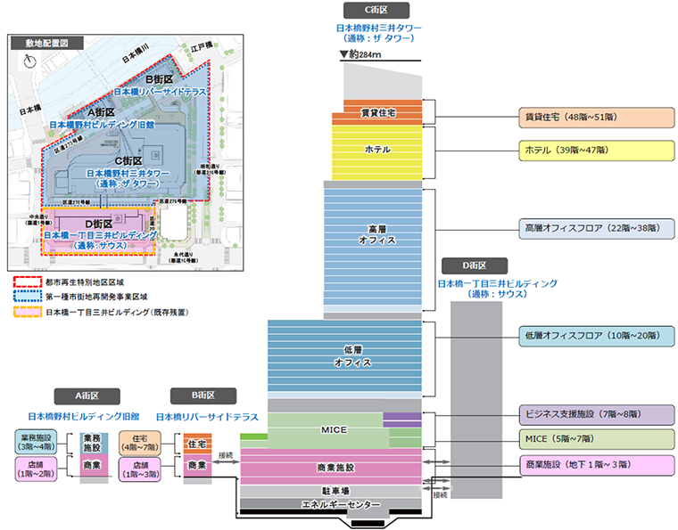 本事業はA・B・C・Dの4街区で構成され、それぞれが個性を持ちながら一体となって、日本橋の新たな国際都市景観を描きます。各街区の建物名称についても以下のとおり決定いたしました。